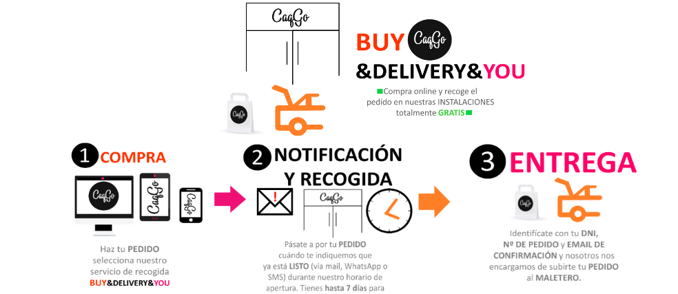 Si te es imposible recoger tu paquete en ese horario ponte en contacto con el equipo de Support Caqgo al correo caqgo@agutquiros.es con tu nombre y apellidos, número de pedido y en el asunto del mail Servicio de Recogida BUY&DELIVERY&YOU y haznos saber tu disponibilidad horaria y así vemos la posibilidad de poder adaptarnos a tu horario.